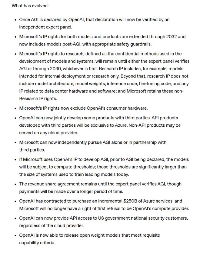 此外,OpenAI仍是微软的前沿模型合作伙伴。根据声明,微软对OpenAI模型和产品的知识产权授权延长至2032年,其中包含了AGI实现之后的模型(需配备适当的安全护栏)。
