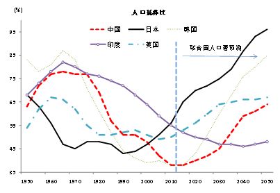 图1 中国、日本、韩国、印度和美国的人口抚养比