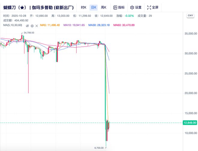 紧接着,二级饰品市场发生巨震。游戏饰品数据分析平台SteamDT显示,10月22日-24日,CS2饰品大盘从1662点直线跳水,暴跌至651点,跌幅超过60%。其中,高端稀有饰品价格集体跳水,例如一款“蝴蝶刀”饰品价格从32000元左右跌至约8000元,短短两天跌去75%。