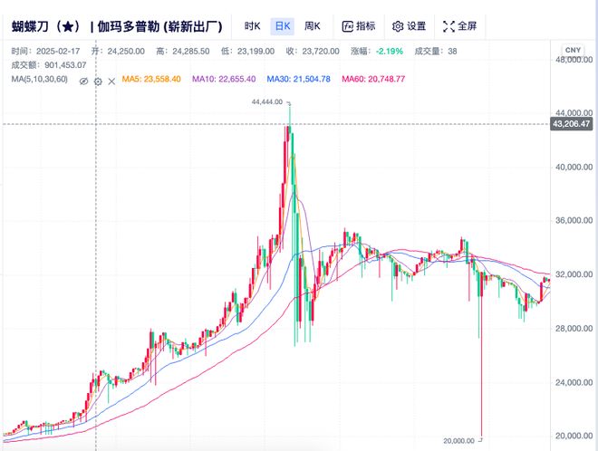 就拿上述“蝴蝶刀”饰品价格走势来说,2025年1月-5月,其价格从19900元一路走高,涨至44000元,随后又在短短4天内,跌至28000元。张书乐也提到,过分炒作带来的喧嚣,让普通玩家很容易被带节奏。