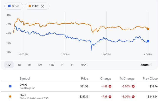 消息报道后,美国博彩公司股价应声下跌。DraftKings股价下挫超5%,FanDuel母公司Flutter Entertainment跌3%。
