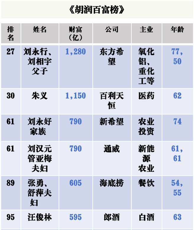 第三名是新希望(000876.SZ)的刘永好家族和通威(600438.SH)的刘汉元、管亚梅夫妇,双方均以790亿元位列百富榜总榜第61位。