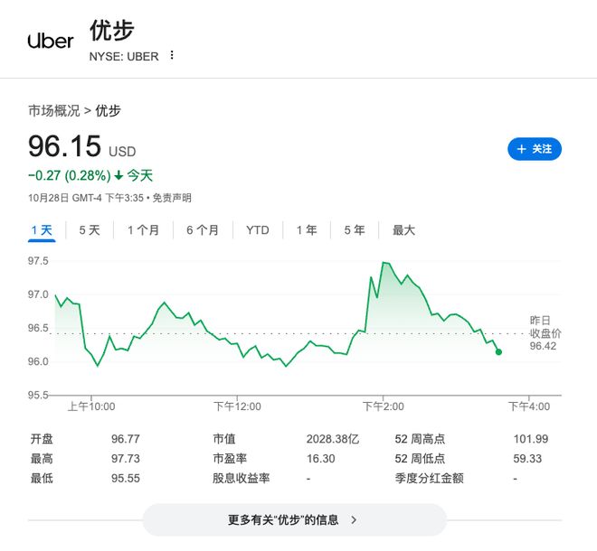 消息公布后,优步股价一度上涨1.2%,但随后转跌。