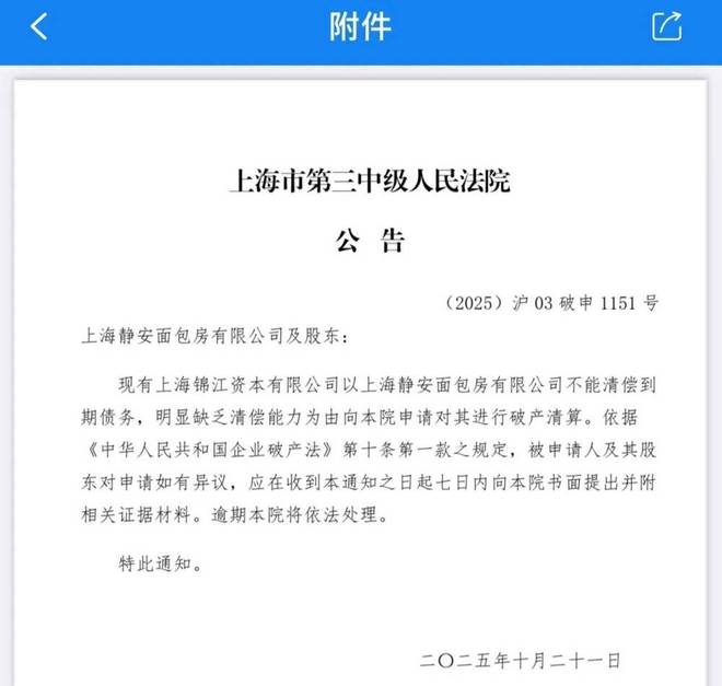 与此同时,上海市第三中级人民法院公告显示,其母公司上海锦江资本有限公司以静安面包房“不能清偿到期债务,明显缺乏清偿能力”为由,向法院申请破产清算,法院已于2025年10月21日启动法律程序。