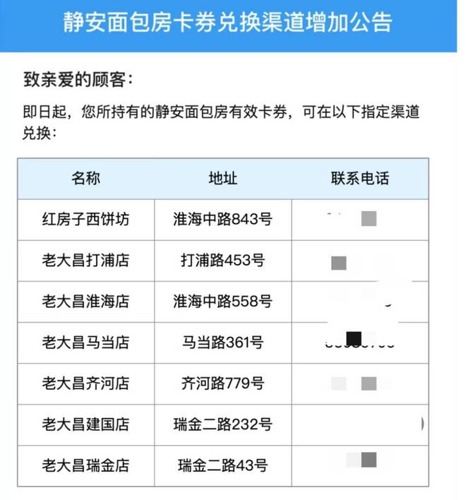 10月25日晚,静安面包房官方微信发布公告称,消费者所持有的静安面包房有效卡券,除了能在静安面包房在营门店兑换外,还可在红房子西饼坊、老大昌等7家门店兑换。