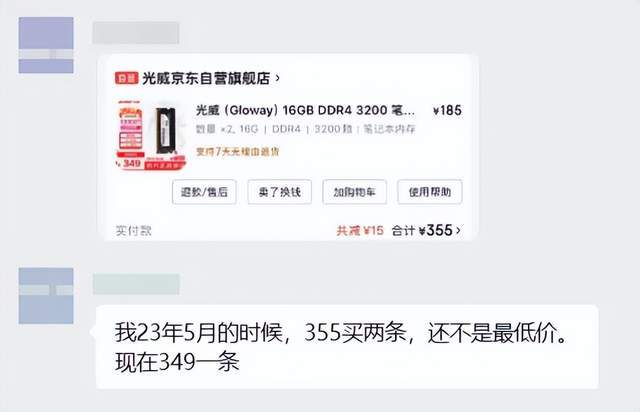 今天一大早,同事爽哥就来找小编吐槽,他2023年花355元就能买两条的DDR4内存条,现在的单价竟然涨到了349元,价格足足翻了快一倍。