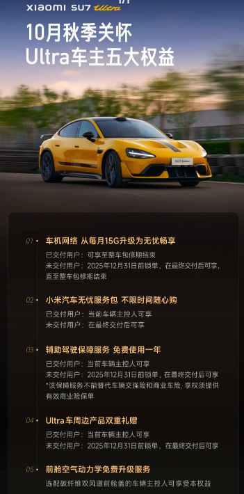 红星资本局10月28日消息,近日小米汽车社区发布“10月秋季关怀”,为小米SU7 Ultra车主提供“五大权益”。其中包括为选配碳纤维双风道前舱盖的车辆主控人提供“前舱空气动力学免费升级服务”。