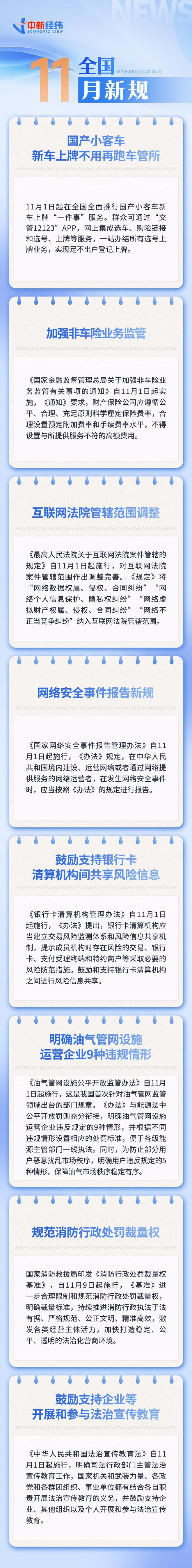 中新经纬10月29日电 (王永乐)国产小客车新车上牌不用再跑车管所、互联网法院管辖范围调整、海南离岛旅客免税购物政策调整……2025年11月,一大波新规将施行,哪一项与你有关?