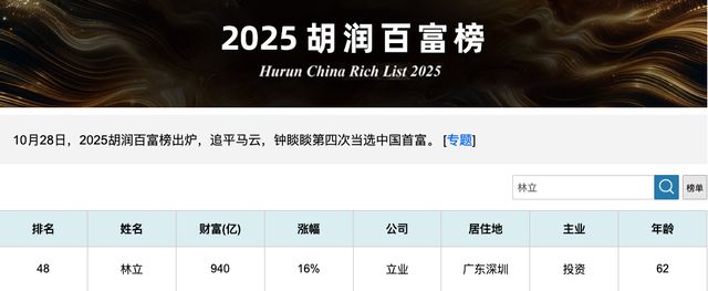 值得一提的是,林立曾一度问鼎“深圳首富”,其2007年以168.3亿元的身家财富位居2007年《福布斯》中国富豪榜第23位,而彼时马化腾以101.9亿元财富位列第40位。《2025胡润百富榜》上,林立以940亿元财富位列第48位。