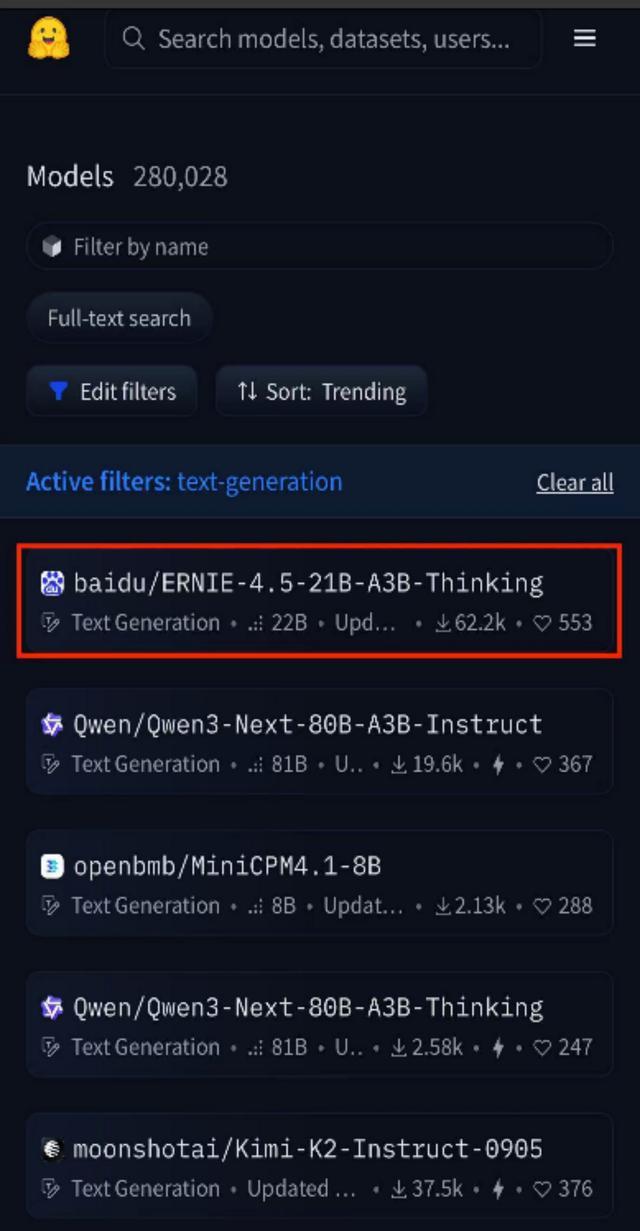 与此同时,百度的开源模型多次登顶国际模型排行榜。截至2025年9月12日,百度最新开源的文心思考模型ERNIE-4.5-21B-A3B-Thinking在HugginFace全球模型总趋势榜和文本模型趋势榜均排名第一。10月16日,百度最新开源模型PaddleOCR-VL发布后16小时内登顶HugginFace Trending,连续5天稳居榜首。