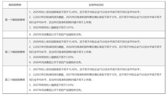 具体来看,三期解除限售期业绩考核条件中,要求投入资本回报率均应不低于15.42%,且不低于对标企业75分位水平或同行业平均值;均以2023年归母净利润为基数,2025-2027年归母净利润年复合增长率应不低于12%,且不低于对标企业75分位水平或同行业平均值;2025-2027年,研发投入强度应分别不低于3.91%、3.92%、3.93%;同期均要求完成集团公司下发的产业链相关任务。