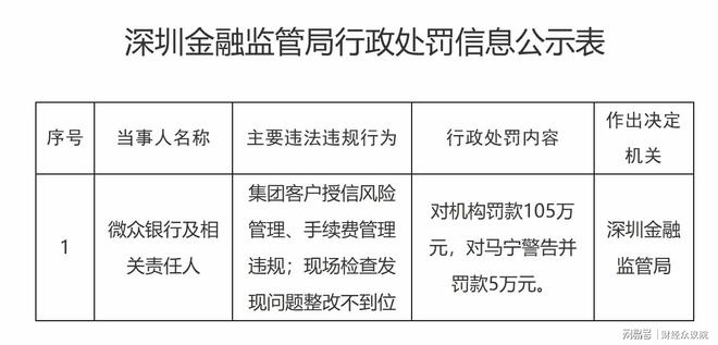 10月28日,深圳金融监管局披露了对微众银行的罚单。微众银行因“集团客户授信风险管理、手续费管理违规;现场检查发现问题整改不到位”被罚105万元。同时相关责任人马宁被警告并罚款5万元。