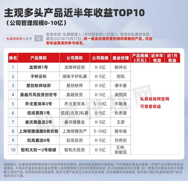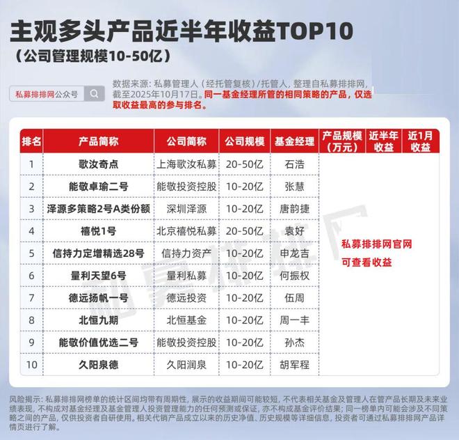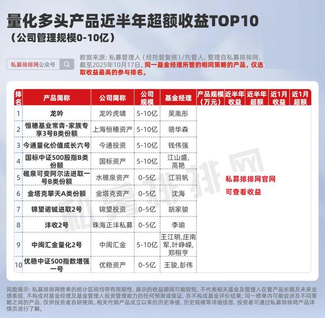 那么,在规模为50亿以上、10-50亿、0-10亿的私募中,近半年收益位列10强的量化多头产品和主观多头产品分别有哪些呢?(注:同一基金经理所管的相同策略的产品,仅选取收益最高的参与排名)