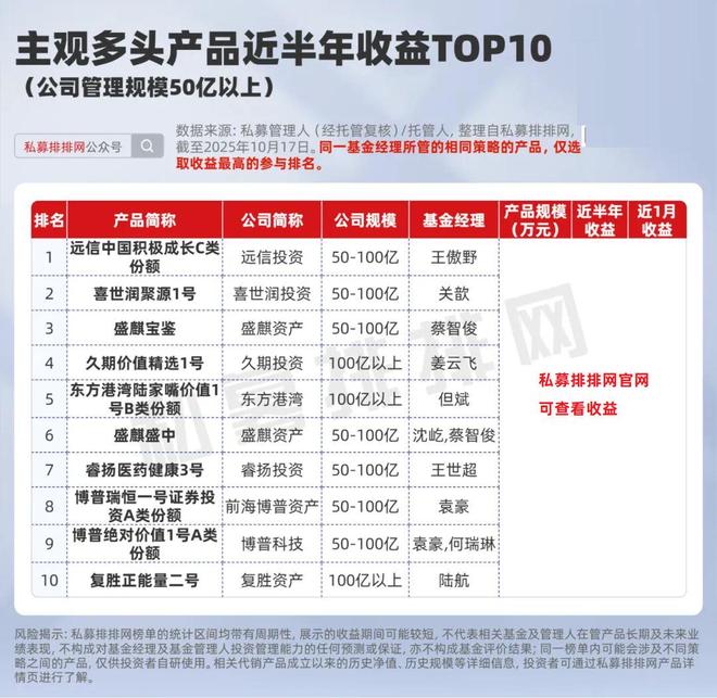 在头部私募(规模50亿以上)中,主观多头产品共有272只,平均收益为34.77%。其中近半年收益10强的产品上榜门槛为***%。