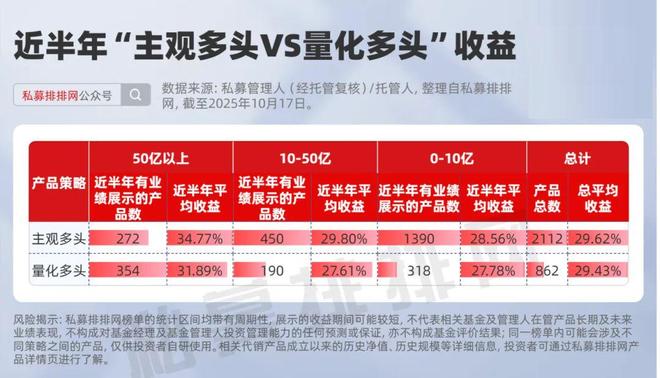 私募排排网数据显示,截至2025年10月17日,有近半年业绩展示的主观多头、量化多头产品分别有2112只、862只,平均收益分别为29.62%、29.43%。分规模来看,在50亿以上、10-50亿以及0-10亿规模的私募中,主观多头均跑赢量化多头产品。