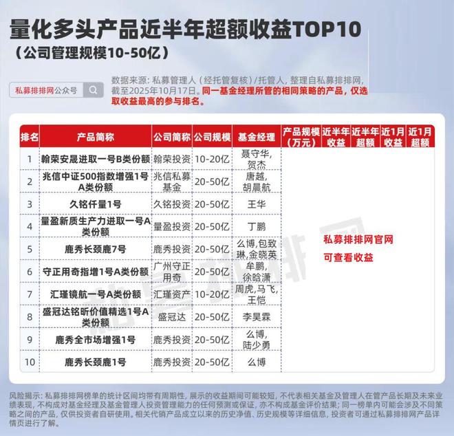 另外,量化多头产品共有318只,平均收益为27.78%。其中,近半年超额收益10强的产品上榜门槛为***%。
