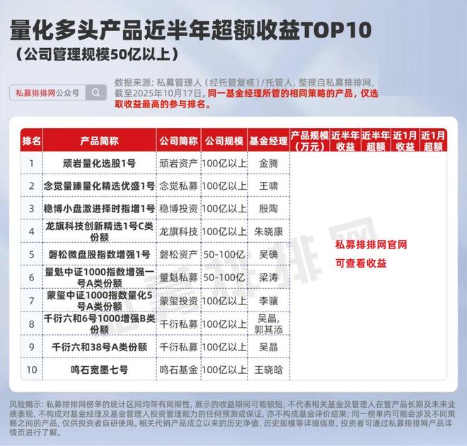 在以上10强量化多头产品中,近1个月跑出正超额的产品共有5只。其中,近半年超额收益(***%)最高的是“量魁中证1000指数增强一号A类份额”,由量魁私募梁涛管理。