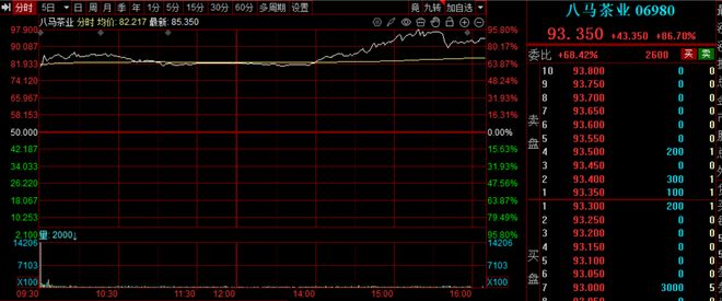10月28日上午九时,八马茶业(06980.HK)正式在港交所开始买卖,股价开盘便一度上涨超60%,截至收盘时,股价为93.35港元/股,涨幅达到86.70%。
