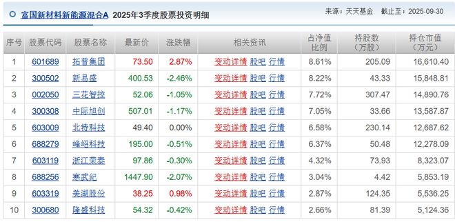 从持仓来看,富国新材料新能源的前三大行业分别是电子、汽车、电力设备,占比较高,前十大重仓股集中度在57.43%左右。