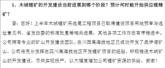 面对“预计何时能开始供应锂精矿”的投资者提问,盛新锂能没能给出时间表。