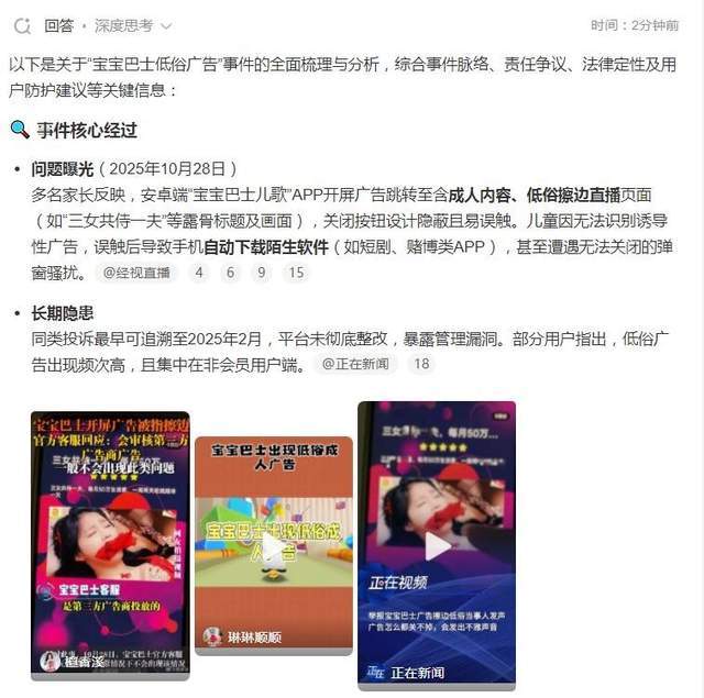10月28日,多名家长向媒体反映,宝宝巴士App开屏广告跳转至含成人内容、低俗擦边直播等露骨标题和画面,且关闭按钮设计隐蔽易误触,儿童无法识别导致误触后手机自动下载短剧、D博类App,甚至遭遇无法关闭的弹窗骚扰……