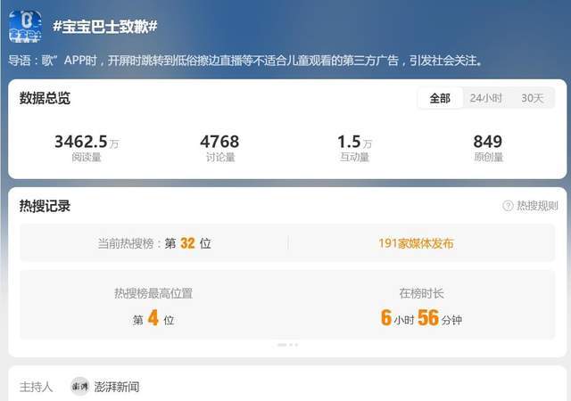 经多家媒体报道之后,#宝宝巴士 低俗广告#空降热搜第一之势将舆情引爆,截至本文发稿,#宝宝巴士 低俗广告#话题的详细数据页已不可见状态,而#宝宝巴士致歉#、#宝宝巴士整改#等话题则正常显示,其中#宝宝巴士致歉#话题共有191家媒体发布相关报道,阵势之大,近期罕见。