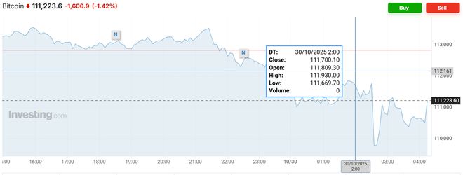 - 比特币短线从11.2万美元附近跳水,至接近10.9万美元的水平。