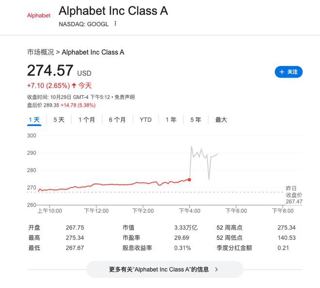 每股收益:谷歌母公司Alphabet三季度净利润跃升41%,达到285亿美元;每股收益2.87美元,高于华尔街预估的2.26美元。