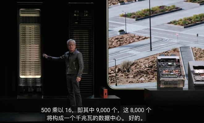 现在,那是一个机架。一个千兆瓦级的数据中心会有,来算算,16个机架大约是姑且叫它 9,000,8,000 个这样的将是一个一千兆瓦的数据中心。所以那将是未来的 AI 工厂。