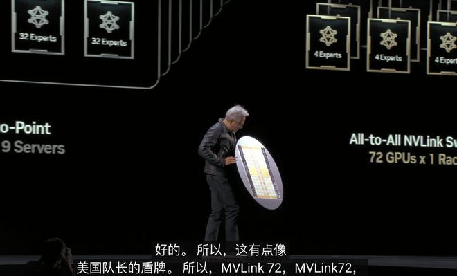 因此,这个价值数万亿美元的巨型AI 模型汇聚了众多不同领域的专家。我们将所有这些不同领域的专家都集中到一个 GPU 上。现在,这是 NVLink 72。我们可以把所有芯片都集成到一块巨型晶圆上,每位专家都能相互交流。因此,这位首席专家能够与所有在岗的专家进行交流,以及所有必要的上下文、提示和我们必须处理的大量数据,一堆tokens,我们必须发送给所有专家。专家们会…… 无论哪位专家被选中解答问题,都会随即尝试作出回应。