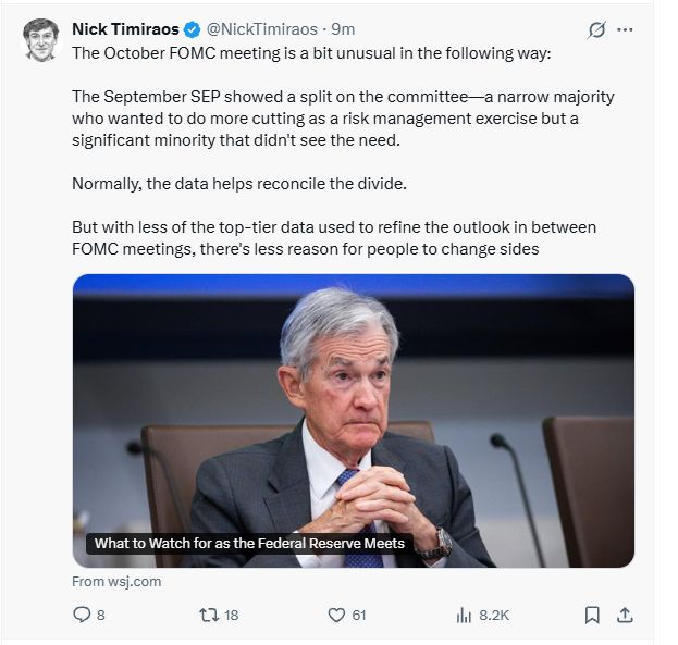 Timiraos认为,10月的FOMC会议在以下方面有些不同:9月的点阵图显示了委员会内的分歧——大多数人倾向于继续降息作为风险管理的手段,但也有相当一部分人认为没有降息的必要。通常情况下,数据可以帮助调和这一分歧。然而,由于在FOMC会议之间少了用来完善前景的高层次数据,因此成员们更少有理由改变立场。