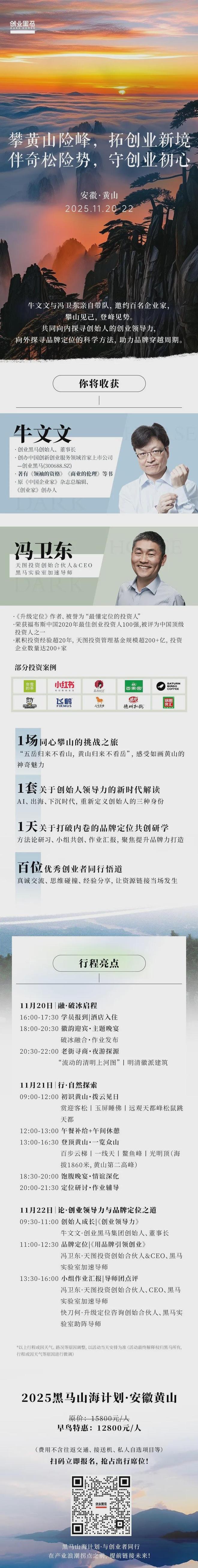 报名「黑马·山海计划班」,11月20日-22日,天图投资创始合伙人&CEO冯卫东将与创业黑马董事长牛文文,亲自带一批黑马的同学们,一起走进安徽黄山。