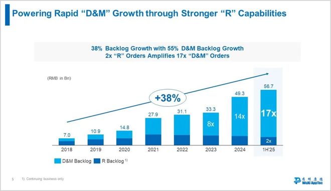 回看过往业绩表现,订单层面,和2018相比,药明康德用两倍增长的R端在手订单,撬动了17倍膨胀的D&M端订单;临床3期在研和商业化阶段的小分子项目,从2022年的107个增长到2025年三季度末的167个,增长56%。