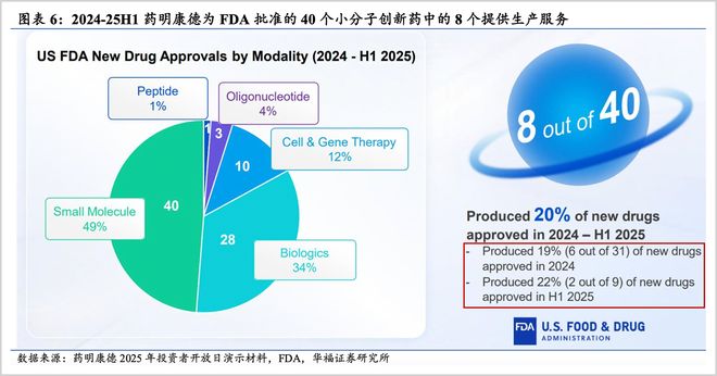 从2024年到今年上半年,FDA批准上市的40个小分子创新药中,药明康德化学业务平台为其中8个提供服务,占比20%。