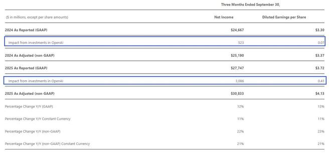 财报显示,GAAP口径下,三季度投资OpenAI对微软净利润带来的影响为30.86亿美元,远超一年前的5.23亿美元,对EPS盈利的影响为每股0.41美元,也远超一年前的每股0.07美元。