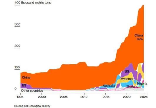 多项数据显示,中国在稀土开采生产中占据主导地位(彭博社制图)