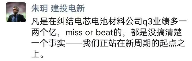就在10月31日上午,朱玥再度发声:凡是在纠结电芯电池材料公司Q3业绩多一两个亿,miss or beat的,都是没搞清楚一个事实——我们正站在新周期的起点之上。