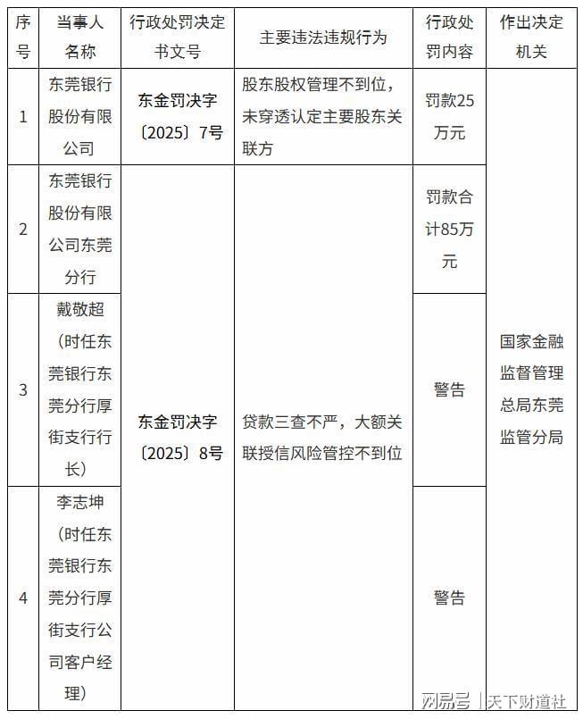 不久前,东莞金融监管分局对东莞银行及其东莞分行开出两张罚单:东莞银行因“股东股权管理不到位、未穿透认定主要股东关联方”被罚款;东莞分行则因“贷款三查不严,大额关联授信风险管控不到位”被罚款,公司两名高管受到警告。