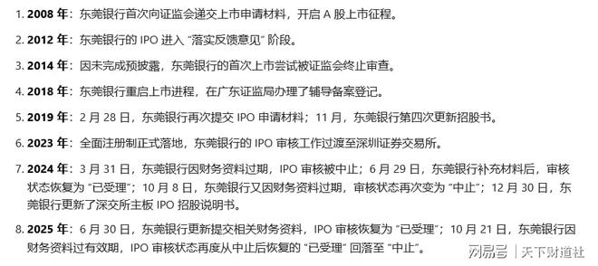 另外,东莞银行的IPO之路也还有希望重启。有业内人士对《天下财道》表示,因财务资料过期导致的IPO中止,企业需在3个月内完成财报更新并提交,审核即可恢复,最快1个月内可重启。从之前几次情况观察,东莞银行上市进程被中止后,都在三个月内实现了重启。