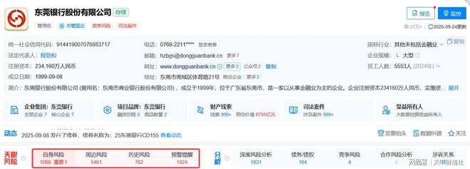 东莞银行风控能力也有待提高。天眼查显示,东莞银行自身风险1069条,周边风险5461条,预警提醒1924条。