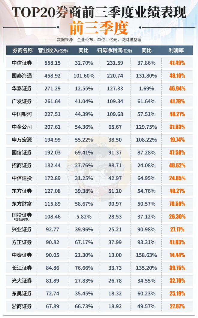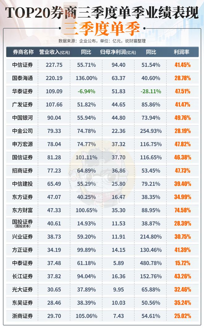 看,TOP20券商三季度单季的业绩表现,除了华泰证券是跌的,其他全部都是上涨的!