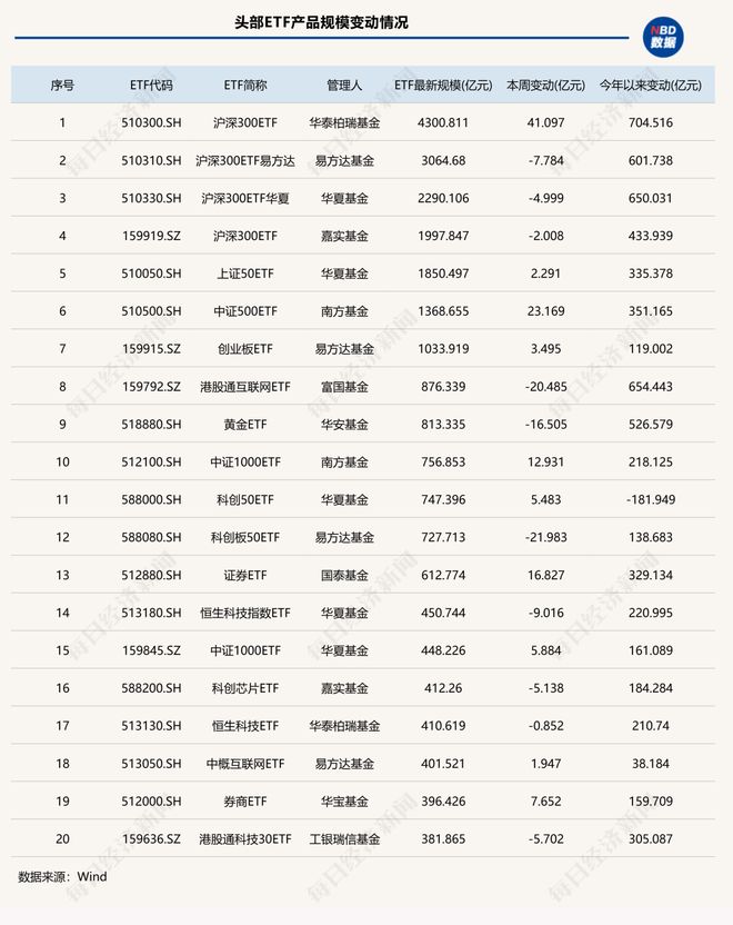 管理人方面,“ETF千亿俱乐部”又添新成员!天弘基金ETF规模本周突破1000亿元,让 “大佬群” 扩至16家。从头部产品来看,“强者恒强”格局依然延续,华泰柏瑞沪深300ETF依旧稳坐“C位”,本周规模新增超40亿元,年内扩容超700亿元,两项数据均为单品第一。