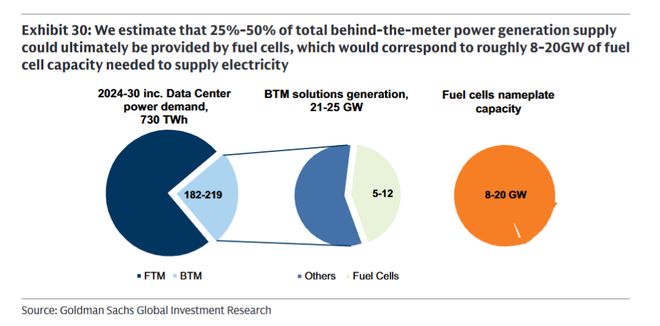 综合以上优势,高盛对燃料电池在数据中心市场的应用前景极为乐观。报告的核心预测是,到2030年,燃料电池将占据BTM解决方案市场25%至50%的份额,相当于8-20吉瓦(GW)的装机容量。