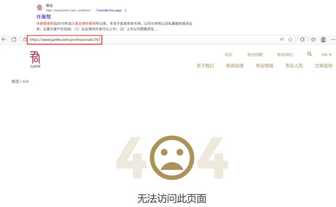 视频曝光后,君合未发表官方声明,但其官网已下架许晟骜的合伙人介绍页面,点击链接时提示“404无法访问此页面”。