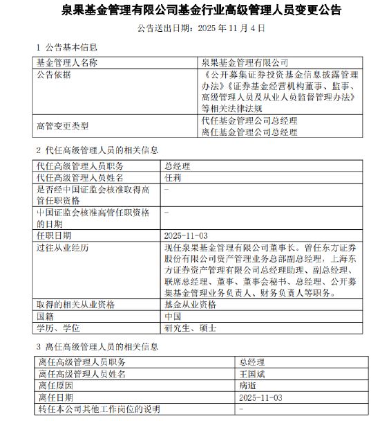 11月3日,泉果基金发布高级管理人员变更公告,王国斌病逝,由董事长任莉代任总经理职务,任职日期2025年11月3日。