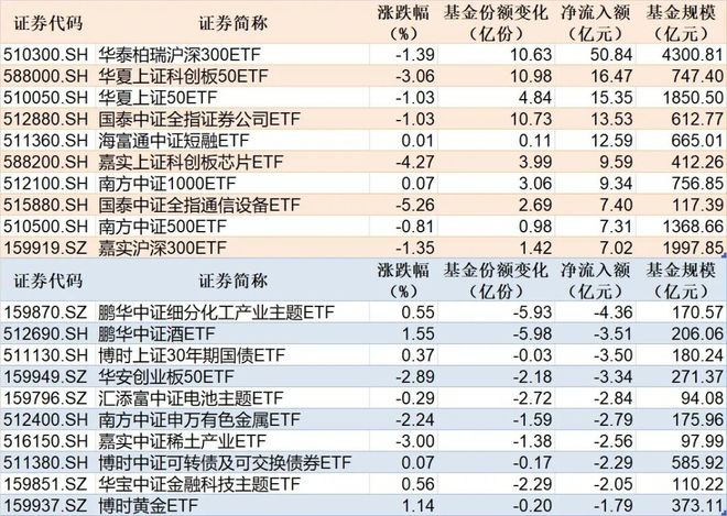 与此同时,鹏华中证细分化工产业主题ETF基金份额减少5.93亿份,净流出额为4.36亿元;鹏华中证酒ETF基金份额减少5.98亿份,净流出额为3.51亿元;博时上证30年期国债ETF基金份额减少0.03亿份,净流出额为3.50亿元。