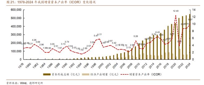“投资于物”发展模式难以为继导致传统“硬投资”持续放缓。近年来,传统“投资于物”模式已愈发难以为继,以增量资本产出率(Incremental Capital Output Ratio, ICOR)衡量的固定资产投资效率正在加速下降。我们的测算结果显示,1978-2008年的很长一段时期,ICOR始终大体围绕2至4的区间进行窄幅震荡,仅个别年份处在区间之外,但近年来ICOR迅速上升,2024年已升大幅至9.97,显示单位经济增长所需的投资规模正快速增加,意味着投资效率正显著趋于弱化。受此影响,基础设施建设、房地产开发等“硬投资”正持续放缓。国家统计局数据显示,2025年前三季度基础设施投资同比仅增长1.1%,房地产开发投资大幅下降13.9%,与“十四五”初期相比增速已出现显著回落。