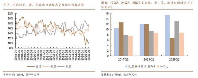 一是中美继续维持“高集中度”经济地位并保持“有限挂钩”的经贸合作。无论是从现价美元还是购买力平价计算的GDP来看,中美“高集中度”的经济地位毋庸置疑。但在中美之间,过往紧密的经贸联系在2018年开始出现松动,并经历了疫情后的波折,随着特朗普再次入主白宫后开启的“关税大战”,2025年双方经贸关系出现裂痕,近6个月中美之间的直接贸易规模均以两位数增速下滑,直接导致中国对美出口占全部出口的比重从15-20%的区间回落至10%附近,美国不再是中国最大的出口对象,而是排在东盟与欧盟之后。从美国进口视角同样能够看到类似结论,对比2017年、2021年及2025年第二季度的美国进口数据,可以看到中国从美国最大的商品来源国逐步落后于欧盟、墨西哥与加拿大。虽然中美直接贸易规模和相互之间的重要性出现下滑,但由于双方在稀土、大豆等领域的互相依赖度较高,中美在4月关税战后开启了多轮谈判,并在近期计划进行新一轮谈判,预计未来中美在经贸领域的合作将是有限度挂钩的状态。
