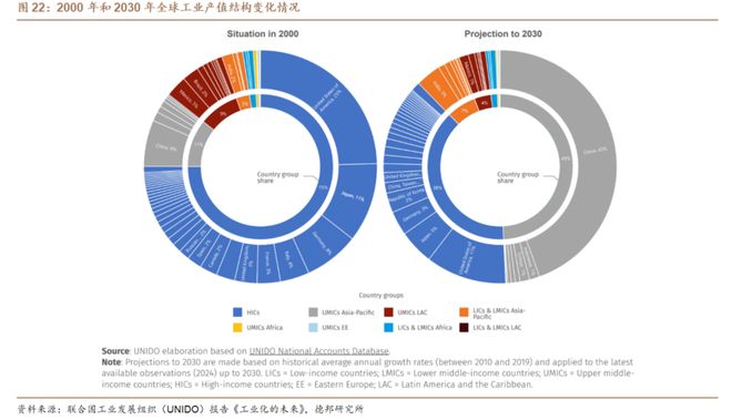 一是因地制宜发展新质生产力将助力我国制造业全球占比再创新高。党的二十届四中全会公报明确提出,要坚持把发展经济的着力点放在实体经济上,保持制造业合理比重,构建以先进制造业为骨干的现代化产业体系。展望“十五五”时期,我们认为我国由“制造大国”向“制造强国”转型的趋势有望延续并进入决胜阶段,传统产业改造升级、新兴产业培育壮大、未来产业前瞻布局均将取得标志性进展,我国企业在全球产业链、供应链、价值链中的位势将获得进一步提升,并将在激烈的国际竞争中赢得战略主动,制造业在全球中的占比有望再创新高。2024年12月,联合国工业发展组织(UNIDO)发布的研究报告《工业化的未来》中便指出,中国在2000年仅占全球工业总产值的6%,2024年该比例已升至31.6%,预计到2030年该比例有望进一步跃升至45%,同期美、日、德三国占比将分别萎缩至11%、5%和3%,我国制造业的规模优势将进一步扩大。