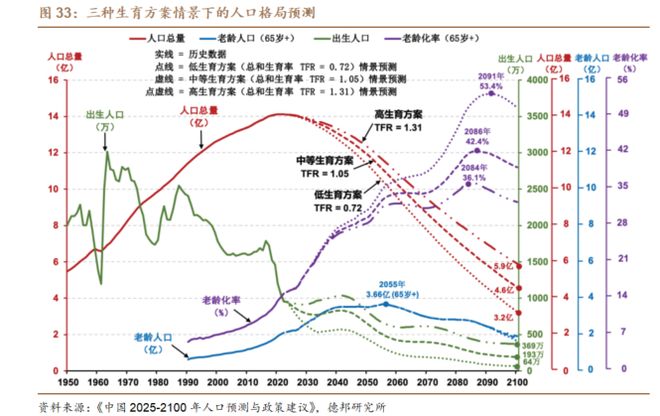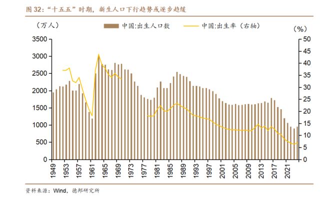 进入2024年后,全国新生人口出现反弹,全年出生约954万,较上年略有回升,出生率提升至6.77‰,为近三年来首次小幅上升。多地数据显示,出生人口降速放缓,部分地区已出现回稳迹象。自“全面三孩”政策实施以来,国家和地方密集出台配套政策,包括育儿补贴、个税抵扣、教育减负、托育体系建设和女性就业支持等,生育环境正持续改善。这些政策使生育意愿在边际上回暖,我们判断出生人口的这一快速下滑阶段在“十五五”时期将告一段落。